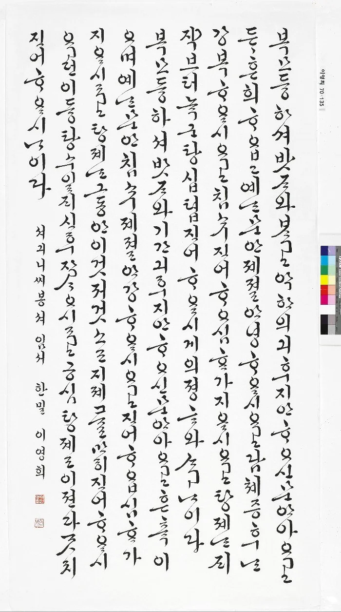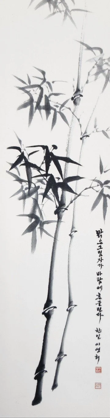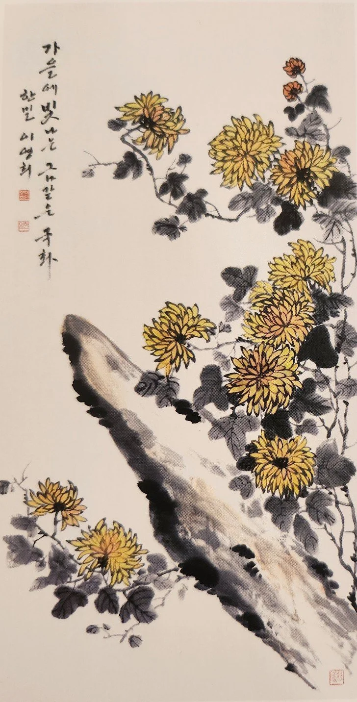 Lee Younghee was a graduate from Hong-Ik University in 1971. She studied calligraphy and the orientals of South Korean cultures to create works of art that indicated beauty and serene simplicity. The simple colors and flowers of her work are shown through soft brushstrokes. She adds elements of traditional Korean art and language onto hanji paper that can be framed and hung into scrolls.
